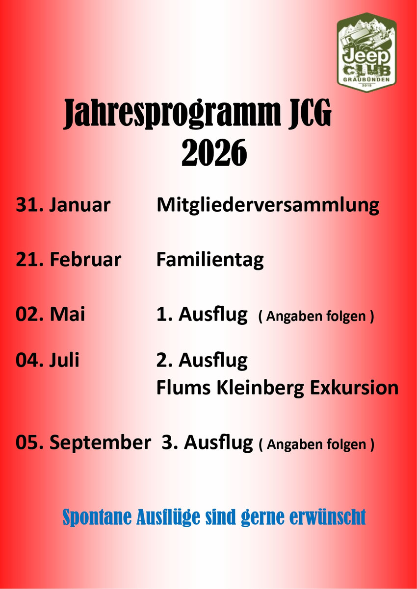 Der Jeepclub Graubünden veranstaltet jährlich 3 Ausfahrten. Wem das nicht genug ist, kann sich innerhalb der Gemeinschaft für weitere Fahrten oder Treffs verabreden.